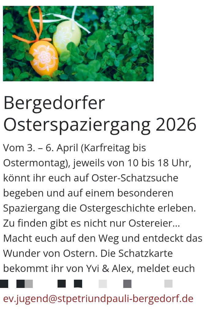 von Karfreitag bis Ostermontag (3. bis 6. April 2026). Hier könnt Ihr auf einem besonderen Spaziergang die Ostergeschichte erleben. Mit der Oster-Schatzsuche erlebt Ihr das Wunder von Ostern, Schritt für Schritt mit allen Sinnen auf einem ganz besonderen Spaziergang. Zu finden sind nicht nur Ostereier …