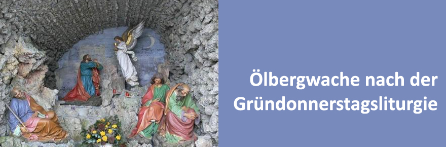 Ölbergwache nach der Gründonnerstagsliturgie Am Gründonnerstag feiert Jesus mit uns das Letzte Abendmahl. Danach wollen wir ihm zum Ölberg folgen, um mit ihm zu wachen und zu beten. Sein Ruf ...