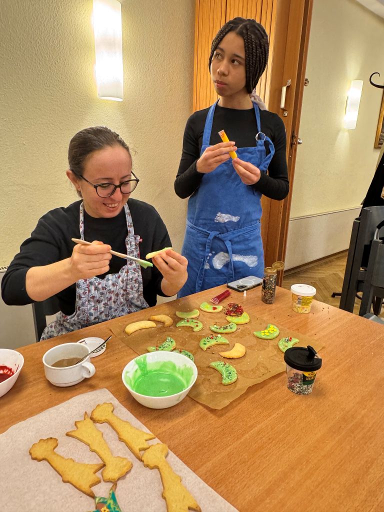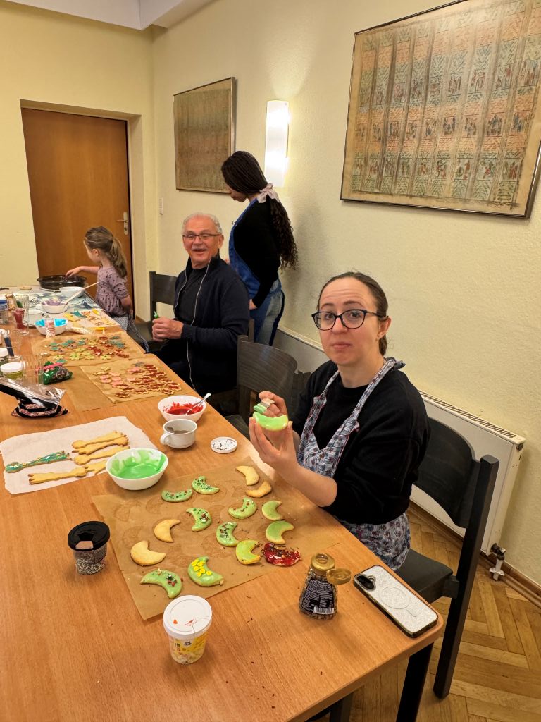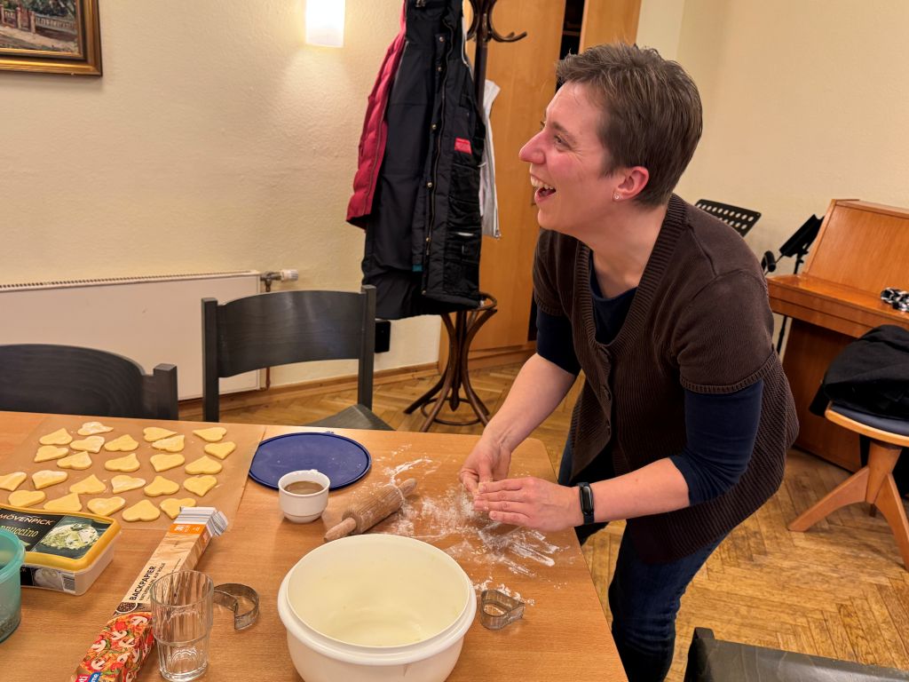 Und so ging’s: Jede teilnehmende Familie brachte einen fertigen Keksteig mit und nach und nach wurden auf den vorbereiteten Tischen Teige ausgerollt und ausgestochen. In der Küche wurde im Minutentakt Keksbleche in den Backofen geschoben und anschließend zur „Weiterverarbeitung“ in den Saal zurückgebracht.