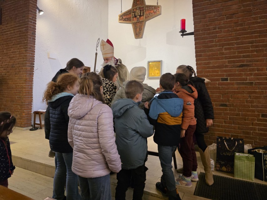 Während der Heiligen Messe kam der Nikolaus zu Besuch und brachte einen großen Korb mit. Daraus beschenkt er jedes Kind mit einer Tüte Süßigkeiten.