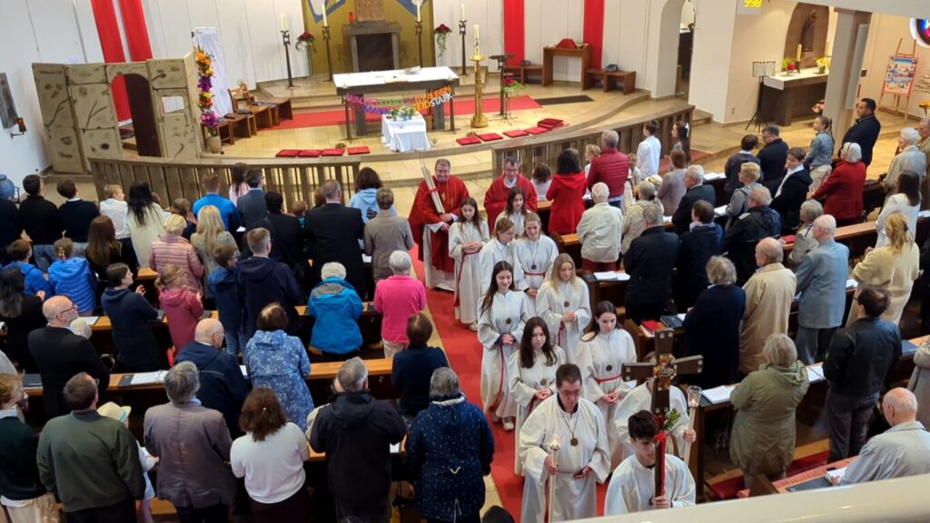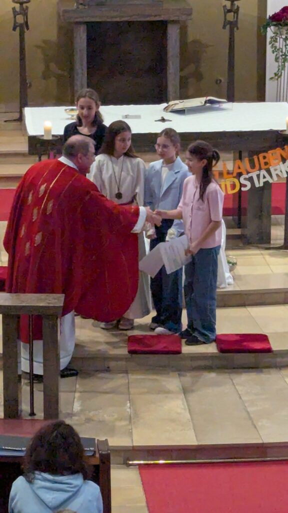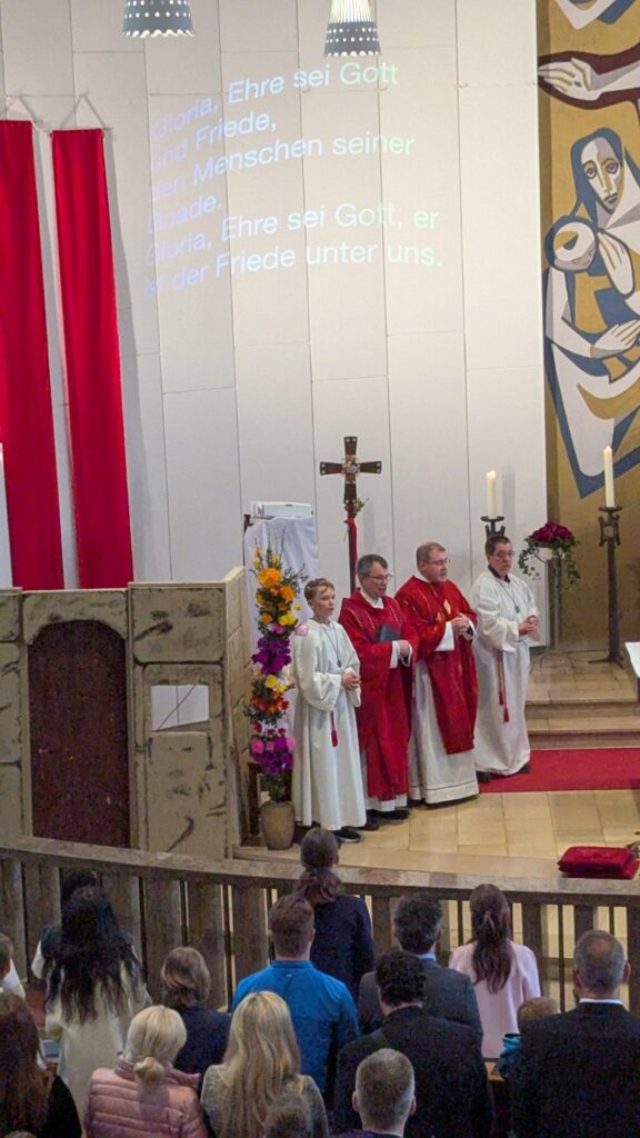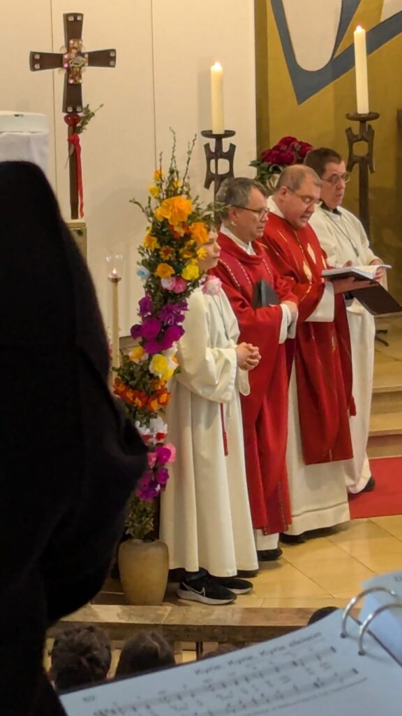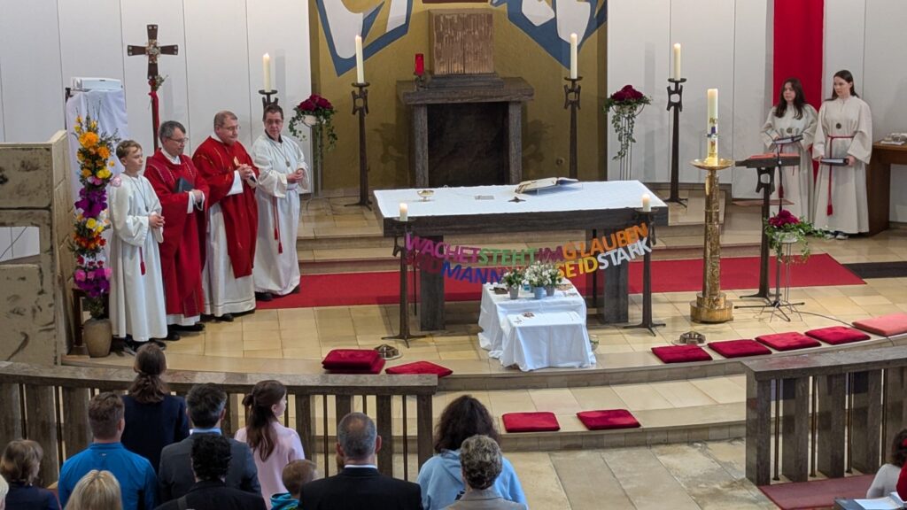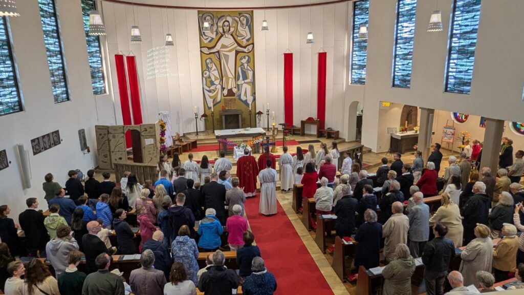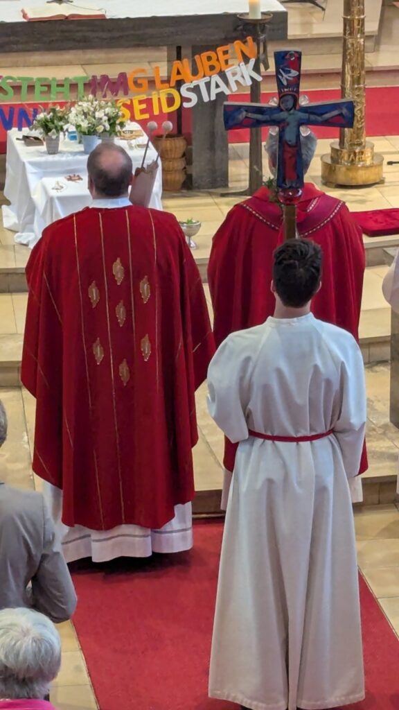 Neupastor Markus Schlenker, der am Tage zuvor im Mariendom seine Priesterweihe empfangen hatte, beging seine erste Eucharistiefeier im roten Gewand mit Feuerzungen in unserer prall gefüllten Kirche, begleitet vom Chor. Mit ihm zelebrierte Pastor Zehe, der ihn schon als Regens des Priesterseminars während seiner Vorbereitungszeit begleitet hatte.