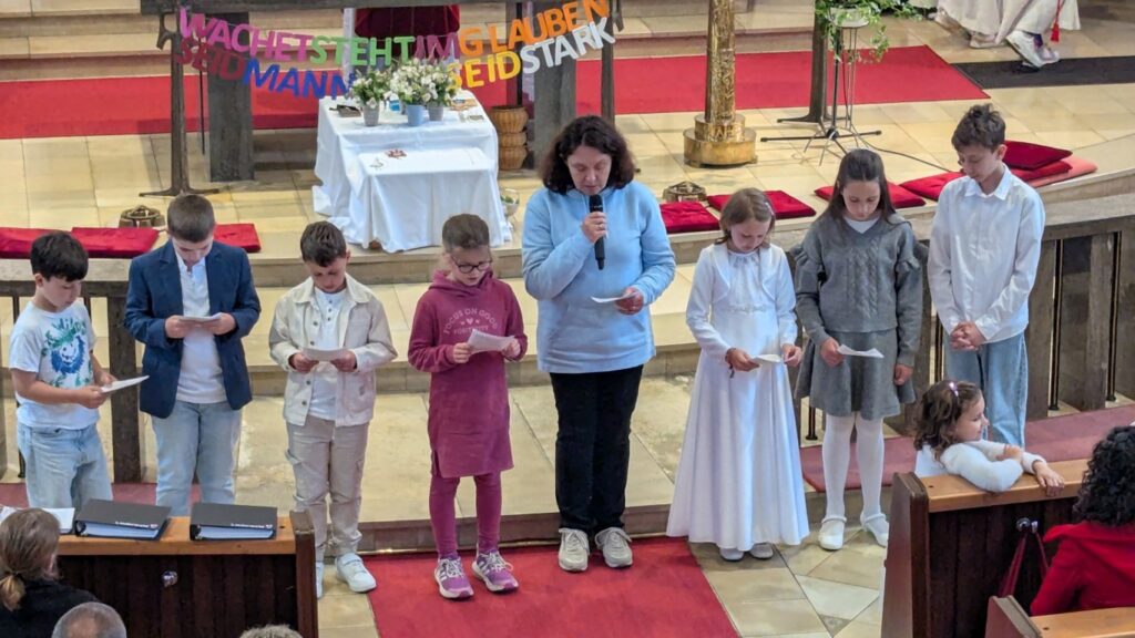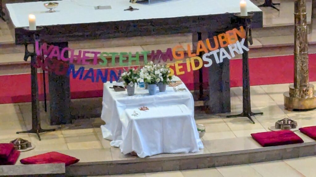 Vor dem Altar auf dem Gabentisch stand das Geschenk der Pfarreimitglieder, eine Hostienschale passend zu seinem Kelch, darüber hatten die Jugendlichen seinen Promizspruch aufgehängt: „Wachet, steht fest im Glauben; seid mannhaft, seid stark!” (1 Kor 16,13).